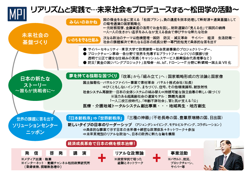 松田政策研究所代表として、経済、財政金融、通貨、外交・安全保障、国際情勢、医療などの社会保障、危機管理、防災、ITや暗号通貨などを軸に、未来の社会システムの構想、政策提案、発信活動などを展開。東京大学でのサイバーセキュリティに関する政策提言活動を活かし、情報セキュリティやブロックチェーンの社会実装の旗振り役として各種事業や啓発活動に従事。最先端の情報技術の活用による防災・減災革命や未来の「協働型コモンズ社会」実現に向けた「ジパングプロジェクト」にその主唱者として携わる。また、未来の素材革命に向けてバサルトファイバーの普及事業を推進。